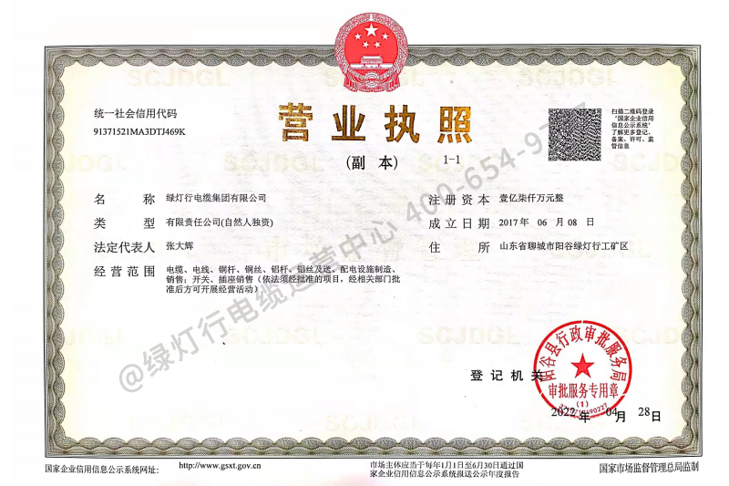 " 綠燈行 " 品牌產(chǎn)品生產(chǎn)商--綠燈行電纜集團(tuán)有限公司,位于山東陽(yáng)谷綠燈行工礦區(qū),擁有占地300余畝的專業(yè)生產(chǎn)廠區(qū),生產(chǎn)和檢驗(yàn)設(shè)備均為精工品牌,倡導(dǎo)工匠精神,嚴(yán)格履行綠燈行質(zhì)量承諾。公司以形象和行為軍事化管理為基礎(chǔ),以產(chǎn)品檢測(cè)如不合格按貨值雙倍賠償,長(zhǎng)度如與標(biāo)示不符差一補(bǔ)百為核心競(jìng)爭(zhēng)力。以 寧可不賣、絕不欺詐 為經(jīng)營(yíng)理念,以 干一番事業(yè),造福一方百姓、文明一方土地 為宗旨。樹立了良好的品牌形象,得到了廣大用戶和社會(huì)各界人士的好評(píng)。